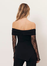 Stand out during your special event with the Rumi blouse and its flattering strapless neckline. Made of a soft stretch knit fabric with lace sleeves, black.